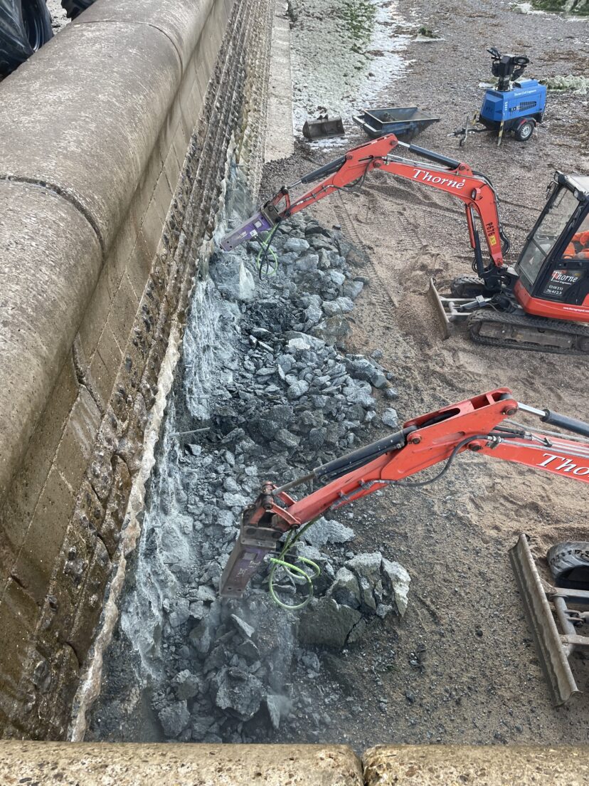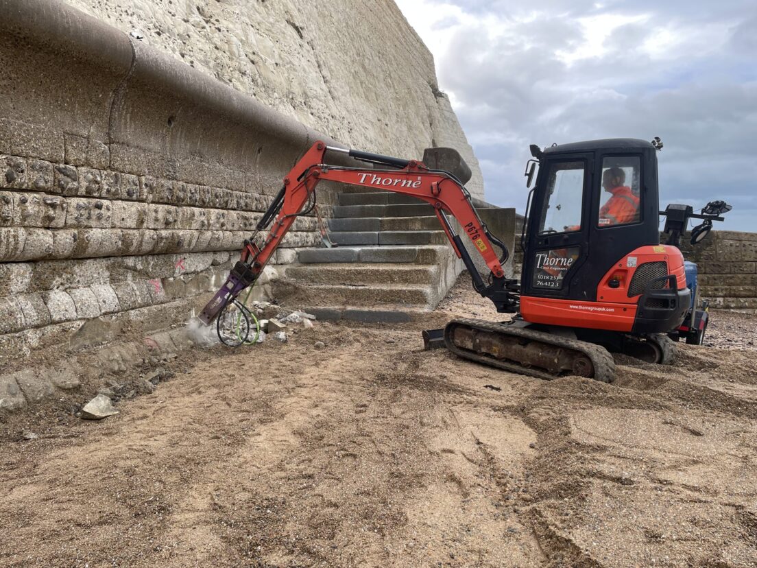 Thorne are carrying out work for Lewes District Council to repair worn out sections of the seawall on the Undercliff Walk in Peacehaven. Sections of damaged seawall are being removed and a like for like repair is being carried out using traditional flint-faced concrete blocks that are being manufactured in house, all as part of an annual winter maintenance programme.